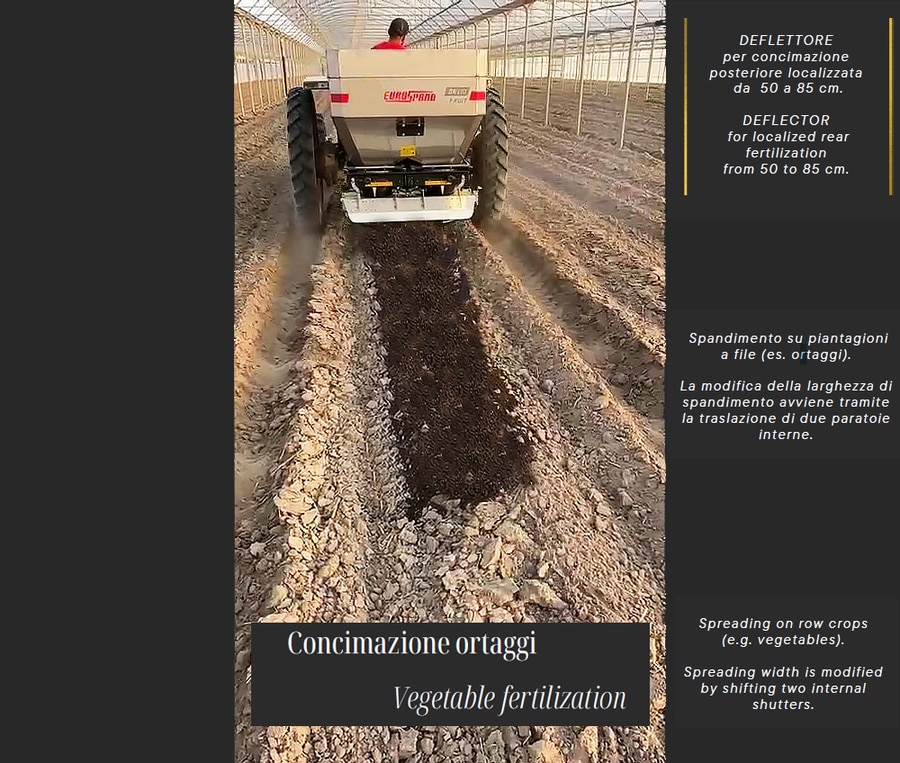 The deflector allows spreading over a rear band of approximately 50 to 85 cm.